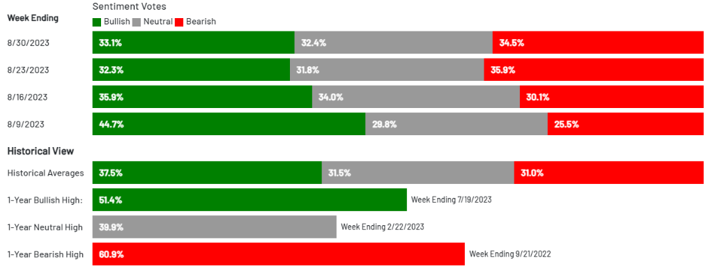 Market sentiment became more bearish in August, surpassing the historical average bearish sentiment of 31%. Given the new labor and consumer confidence data in the last week of August, which supports the soft landing narrative and incentivizes the Fed to suspend rate hikes, bullish sentiment rallied from 32.3% to 33.1%. However, this remains below the historical average of 37.5% for the third consecutive week.