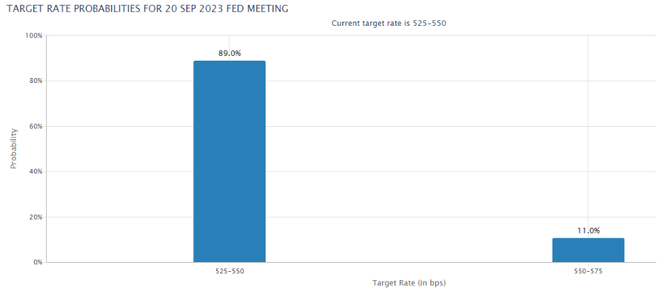 If the inflation risks Powell mentioned materialize, which include a tight labor market driving higher salary inflation, and the lag effect of monetary policies, there's a possibility of future rate hikes exceeding expectations. This hasn't been priced in yet. Currently, the market, indicated by CME, believes there is an 11%(see below) chance of another hike in September, followed by a decline, or at least a plateau, in rates in 2024. If the economy accelerates in the latter half of the year, such changes warrant caution.