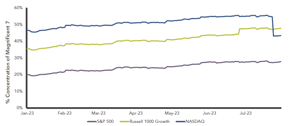 The S&P500 and Nasdaq rebounded from this quarter’s correction, further enhancing their impressive YTD performance. This strong YTD performance is largely credited to the "Magnificent 7," which includes Apple, Microsoft, Alphabet, Amazon, Nvidia, Tesla, and Meta. The Magnificent Seven comprises over 40% of the large-cap growth index; NASDAQ underwent a special rebalancing after reaching 55%+ weight of the index.