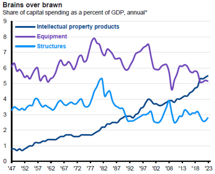 One effect of this thesis is evident by capital expenditures favoring intellectual property spending. Since 2020 this type of investment has been the largest percentage share of GDP for all nonresidential fixed investment components and currently accounts for 5.5% of GDP.
